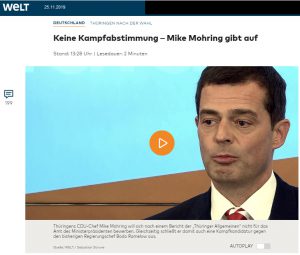 Vier Wochen nach der Landtagswahl streitet die Thüringer CDU heftig über ihren weiteren Kurs. Bei einer Rede auf dem Landestag der Jungen Union (JU) erhielt Mohring von den Delegierten nur spärlich Applaus. Heftige Kritik erntete er für seine Gespräche mit FDP, SPD und Grünen für eine Minderheitsregierung – ein sogenanntes Simbabwe-Bündnis. „Wir haben mit Platz drei keinen Regierungsauftrag“, betonte sein Vize Mario Voigt. Der Wählerauftrag laute Opposition. […]