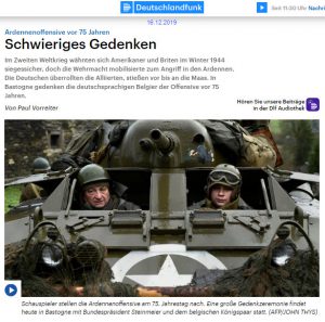 … befindet sich hingegen ein Ort, den die Alliierten im Verlauf der Ardennenoffensive als strategisch wichtig ansahen. St. Vith, der Straßenknotenpunkt entlang der Bahnstrecke Aachen-Luxemburg sollte den Deutschen wieder entrissen werden. Bombardements an den beiden Weihnachtsfeiertagen legten die Stadt fast vollständig in Schutt und Asche, was sich nachhaltig in die Erinnerung der deutschsprachigen Bewohner einbrannte. […]
