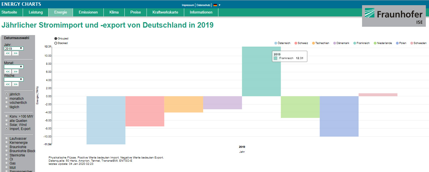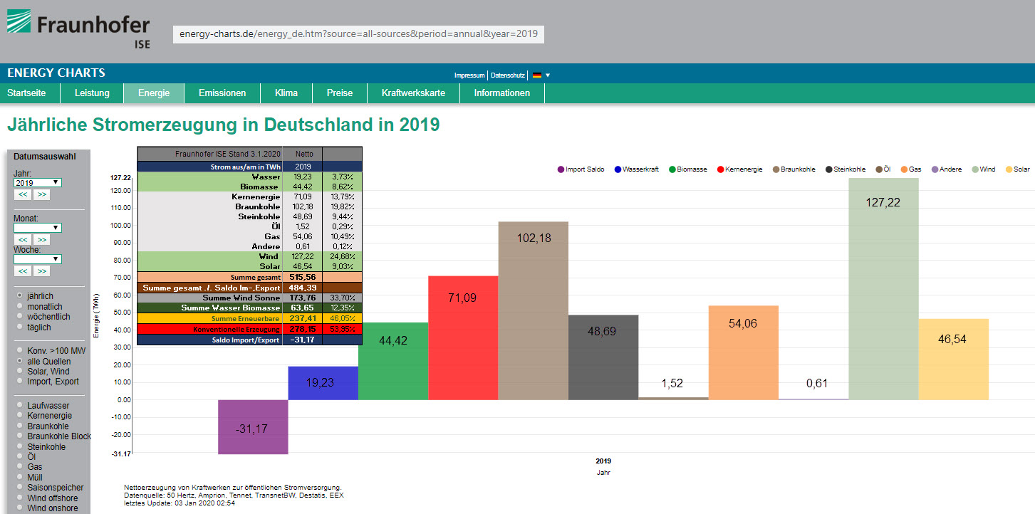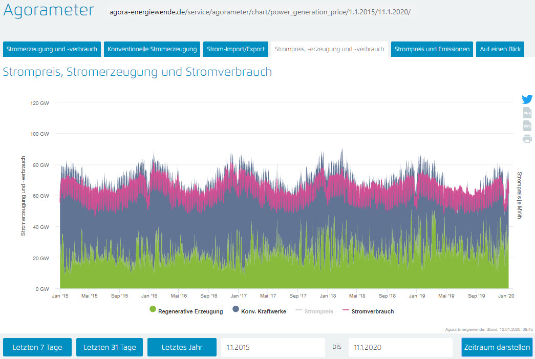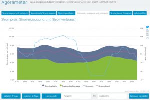 Klicken Sie hier und Sie gelangen auf die Originalseite von Agora-Energiewende. Dort können Sie den Anstieg von knapp 37 GW Strom um 17:00 Uhr am 7.12.2019 auf über 55 GW um 9:00 Uhr am 8.12.2019 nachverfolgen, wenn Sie mit der Maus über den Chart – Kante regenerative Stromerzeugung- fahren . Beachten Sie auch die Entwicklung des Preisgefüges, wenn die Windstromerzeugung ansteigt.