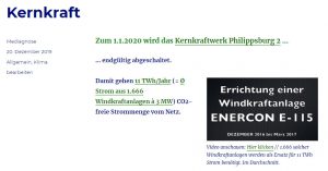 Eine Windkraftanlage (WKA) reicht im Durchschnitt aus, um tatsächlich ein Viertel der Nennleistung (Siehe unten Abbildung 9) an Strom zu erzeugen. Eine 3 MW WKA erzeugt 3.000.000 Watt (W) x 8760 Jahresstunden = 26.280.000.000 Wattstunden (Wh) / 4 = 6.570.000.000 Wh = 6,57 GWh . Man braucht 11.000.000.000.000 Wh / 6.570.000.000 Wh = 1. 674 WKA. Sogar etwas mehr als die oben angegebenen 1.666 WKA. Was den Kohl aber nicht fett macht. Wichtiger ist, dass zu diesen 1.674 WKA theoretischem Ersatz für den Stromwegfall Philippsburg 2, bis Januar 2022 noch mal 5.175 WKA hinzugebaut werden müssten. Macht zusammen 6.749 WKA nur zum Ersatz des wegfallenden Stroms aus Kernenergie von 1/2020 bis 12/2021. Was insgesamt 45 TWh wären. Von gut 71 TWh Strom, der 2019 aus Kernenergie erzeugt wurden (Abbildung 2).