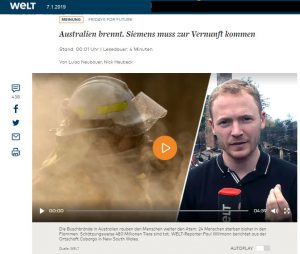[…] Ein Unternehmen, das diesen Schritt noch nicht gegangen ist, ist ausgerechnet Siemens. Der gleiche deutsche Konzern, der öffentlich keine Gelegenheit auslässt, sich zu seiner unternehmerischen Verantwortung zu bekennen und der verspricht, bis 2030 klimaneutral zu sein, plant, für die Mine in Australien die Signalanlage für die Gleise zum Abtransport nach Indien bereitzustellen. […]