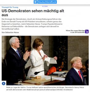 … den viele seiner zahlreichen Gegner schon am Ende sahen. Höhepunkt für Trump war natürlich der Freispruch im Amtsenthebungsverfahren. Sein Vorgehen in der Ukraine-Affäre wird ohne jede Konsequenz bleiben. In seiner aggressiven Genugtuungsrede am Tag danach betonte er wieder und wieder, dass er sich nichts habe zuschulden kommen lassen. Geschickt hatte er es schon während des Verfahrens verstanden, seinen Anhängern einzureden, dass der Impeachment-Angriff auch ihnen galt: Dass ihre Stimmen bei der Präsidentschaftswahl ungültig gemacht werden sollten. Die Demokraten sahen diese Woche mächtig alt aus – als Trump seinen Triumph mit viel Pomp auskostete. […]