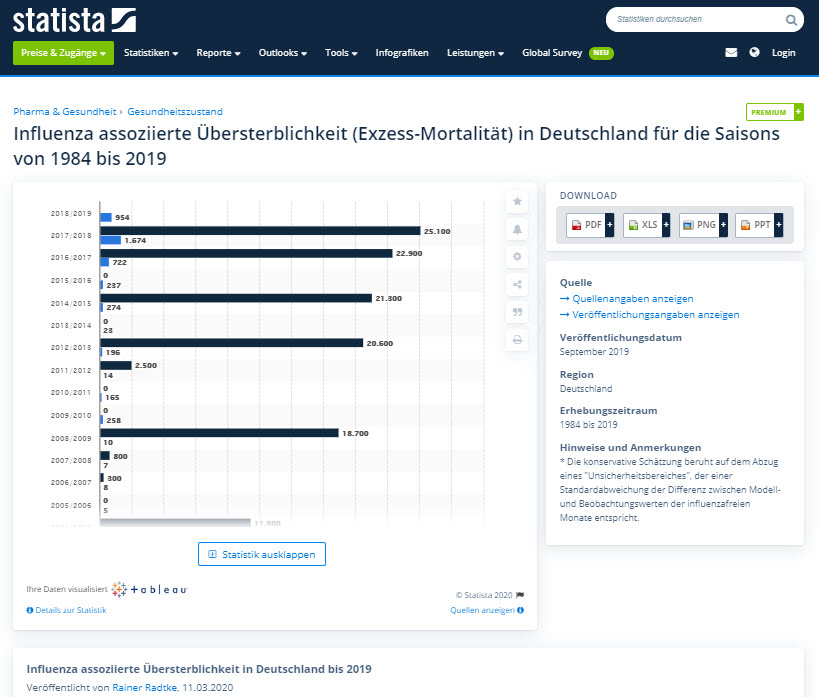 Die Statistik zeigt eine Berechnung zur Übersterblichkeit in Zusammenhang mit Grippe-Erkrankungen in Deutschland für die Saisons 1984/1985 bis 2018/2019. Für die Erfassung der Anzahl der Todesfälle durch Influenza-Erkrankungen sind die Epidemiologen auf Schätz- und Modellwerte angewiesen, da einerseits keine grundsätzliche Meldepflicht für Atemwegserkrankungen besteht und zum andern bei Todesfällen Influenza-Diagnosen oftmals nicht berücksichtigt werden. Bei der hier abgebildeten Übersterblichkeit oder Exzess-Mortalität handelt es sich um eine statistische Modellrechnung. Das Robert Koch-Institut (RKI) errechnet sie, indem sie die Monatsdaten des Statistischen Bundesamtes zur Gesamtmortalität der Bevölkerung mit den Daten der Arbeitsgemeinschaft Influenza zum Verlauf der Grippewelle in Beziehung setzt. Die Zahl der mit Influenza in Zusammenhang stehenden Todesfälle wird – vereinfacht dargestellt – als die Differenz berechnet, die sich ergibt, wenn von der Zahl aller Todesfälle, die während der Influenzawelle auftreten, die Todesfallzahl abgezogen wird, die (aus historischen Daten berechnet) aufgetreten wäre, wenn es in dieser Zeit keine Influenzawelle gegeben hätte. Das Schätz-Ergebnis wird als sogenannte Übersterblichkeit (Exzess-Mortalität [= dunkelblauer Balken / hellblauer Balken = laborbestätigte Todesfälle]) bezeichnet. Die konservative Schätzung von Influenza-assoziierten Todesfällen [… d. h. erhöhte Sterberate verglichen mit dem Durchschnitt in der Bevölkerung und/oder für eine bestimmte Zeitspanne] in der Influenza-Saison 2017/2018 belief sich auf rund 25.100.