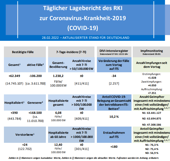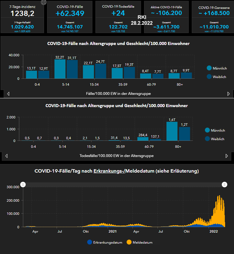 - 28.2.2022 Download 6:30 Uhr: 14.745.107 positiv Getestete, 24 Tote , Genesene etwa 11.010.700 / Inzidenz 1.238,2 alle Daten gemäß RKI Dashboard// Hospitalisierung gesamt 6,23 // ab 60: 12,83 pro 100.000 gemäß RKI Lagebericht