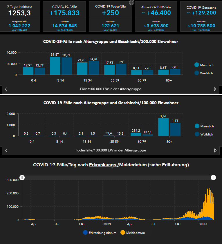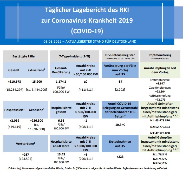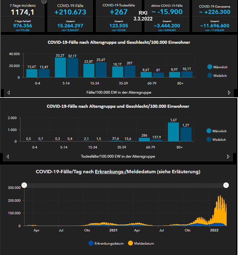 - 3.3.2022 Download 6:30 Uhr: 15.264.294 positiv Getestete, 267 Tote , Genesene etwa 11.696.600 / Inzidenz 1.174,1 alle Daten gemäß RKI Dashboard// Hospitalisierung gesamt 6,14// ab 60: 13,05 pro 100.000 gemäß RKI Lagebericht