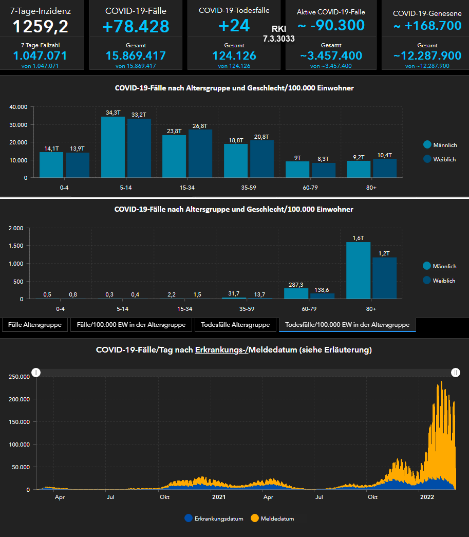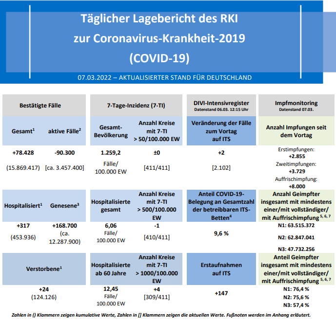 - 7.3.2022 Download 6:30 Uhr: 15.869.417 positiv Getestete, 24 Tote , Genesene etwa 12.287.900 / Inzidenz 1.259,2 alle Daten gemäß RKI Dashboard// Hospitalisierung gesamt 6,36// ab 60: 13,51 pro 100.000 gemäß RKI Lagebericht