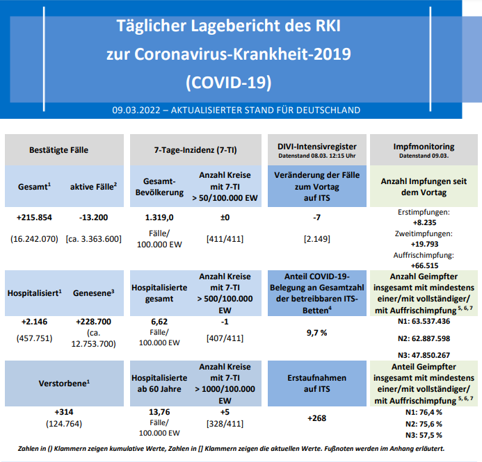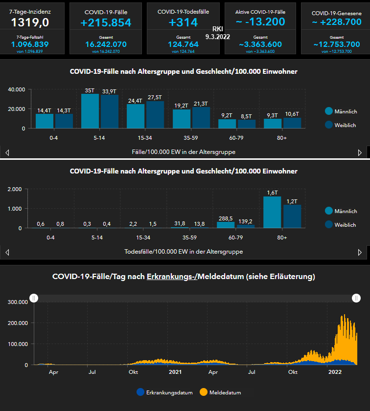 - 9.3.2022 Download 6:30 Uhr: 16.242.070 positiv Getestete, 314 Tote , Genesene etwa 12.753.700/ Inzidenz 1.319,0 alle Daten gemäß RKI Dashboard// Hospitalisierung gesamt 6,05// ab 60: 12,45 pro 100.000 gemäß RKI Lagebericht