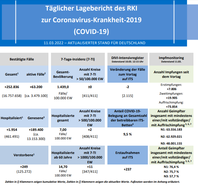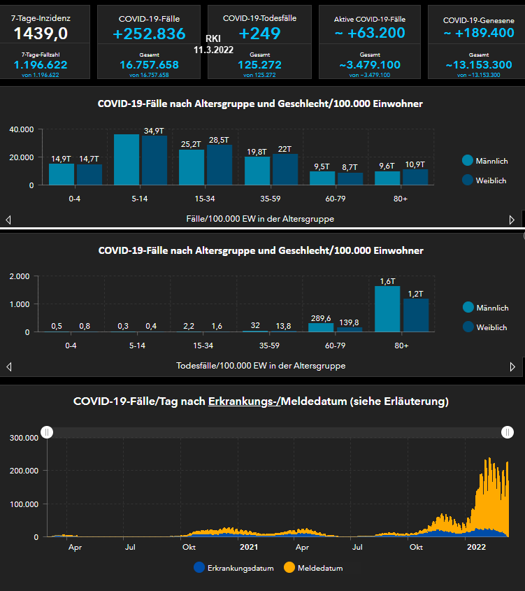 - 11.3.2022 Download 6:30 Uhr: 16.757.658 positiv Getestete, 249 Tote , Genesene etwa 13.153.100/ Inzidenz 1.439,0 alle Daten gemäß RKI Dashboard// Hospitalisierung gesamt 6,75// ab 60: 14,25 pro 100.000 gemäß RKI Lagebericht