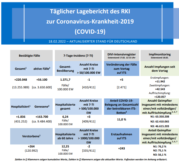 - 18.2.2022 Download 6:30 Uhr: 13.255.989 positiv Getestete, 264 Tote , Genesene etwa 9.484.400 / Inzidenz 1.371,7 alle Daten gemäß RKI Dashboard// Hospitalisierung gesamt 5,97 // ab 60: 11,63 pro 100.000 gemäß RKI Lagebericht
