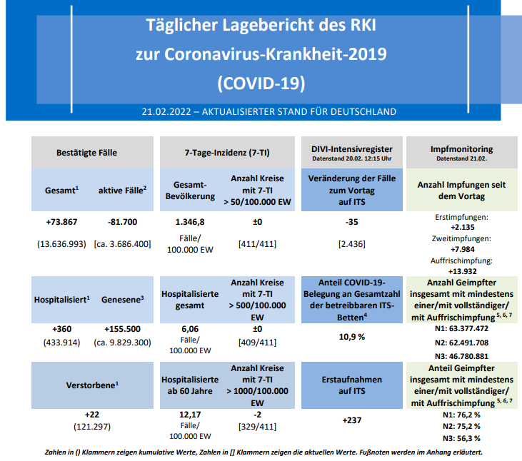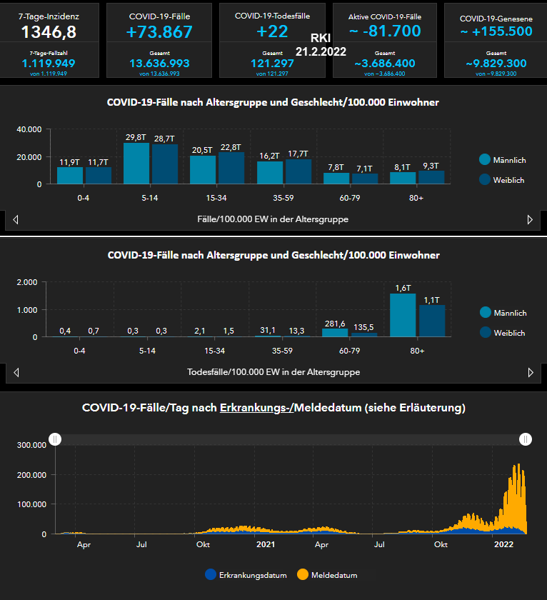 - 21.2.2022 Download 6:30 Uhr: 13.636.993 positiv Getestete, 22 Tote , Genesene etwa 9.829.300 / Inzidenz 1.346,8 alle Daten gemäß RKI Dashboard// Hospitalisierung gesamt 6,24 // ab 60: 12,25 pro 100.000 gemäß RKI Lagebericht