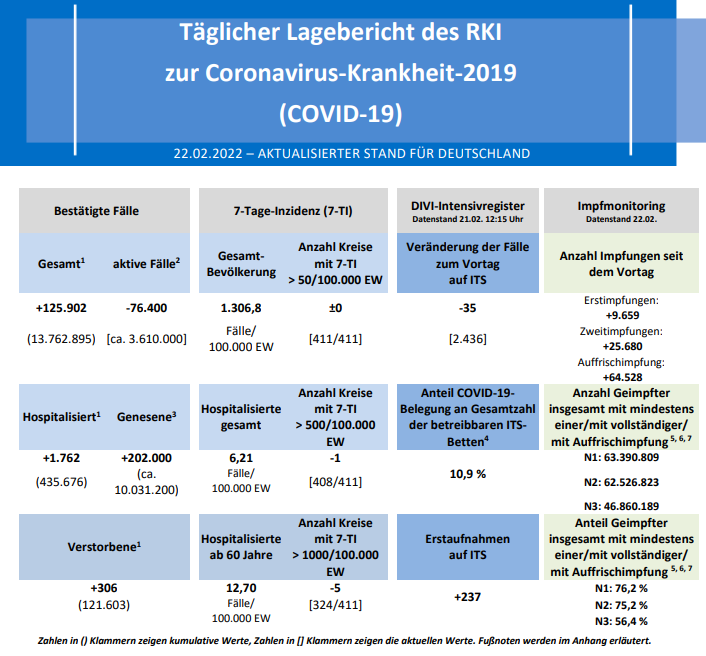 - 22.2.2022 Download 6:30 Uhr: 13.762.895 positiv Getestete, 306 Tote , Genesene etwa 10.031.200 / Inzidenz 1.306,8 alle Daten gemäß RKI Dashboard// Hospitalisierung gesamt 6,17 // ab 60: 12,17 pro 100.000 gemäß RKI Lagebericht