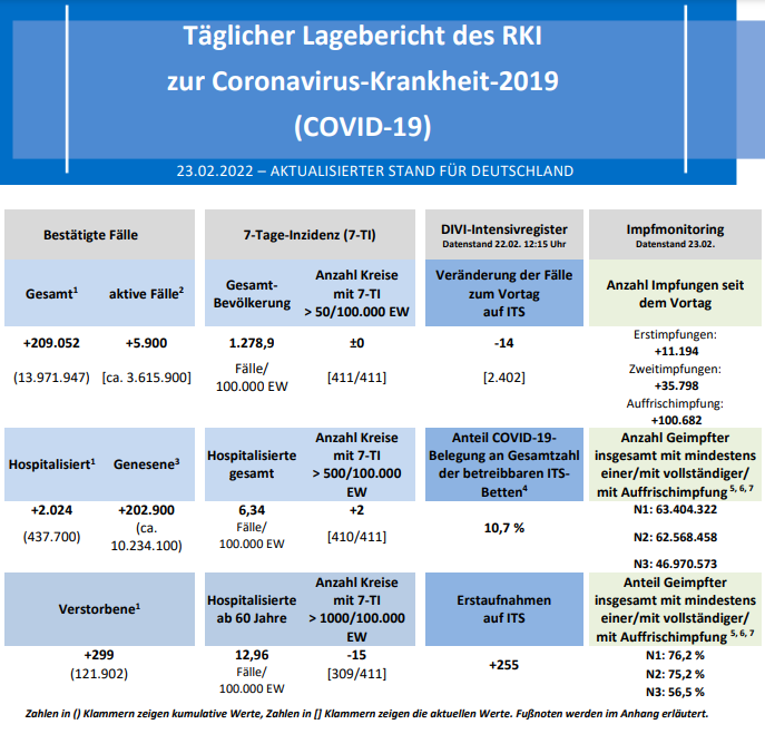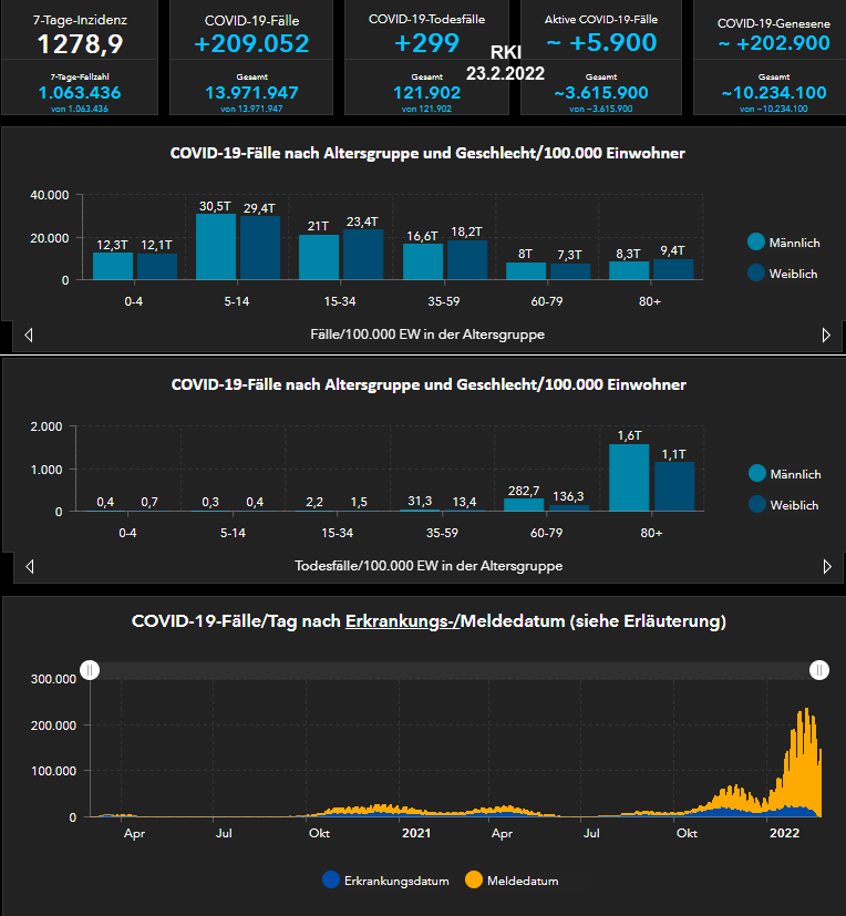 - 23.2.2022 Download 6:30 Uhr: 13.971.947 positiv Getestete, 299 Tote , Genesene etwa 10.249.100 / Inzidenz 1.265,0 alle Daten gemäß RKI Dashboard// Hospitalisierung gesamt 6,25 // ab 60: 12,70 pro 100.000 gemäß RKI Lagebericht