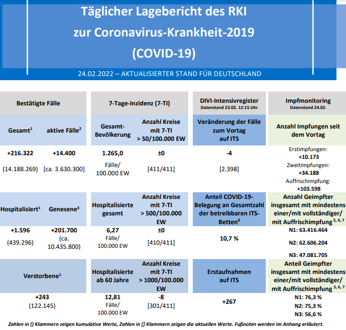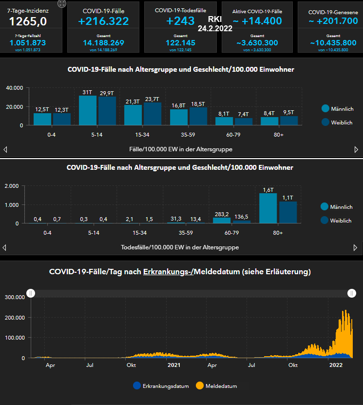 - 24.2.2022 Download 6:30 Uhr: 14.188.269 positiv Getestete, 243 Tote , Genesene etwa 10.235.800 / Inzidenz 1.278,9 alle Daten gemäß RKI Dashboard// Hospitalisierung gesamt 6,34 // ab 60: 12,96 pro 100.000 gemäß RKI Lagebericht