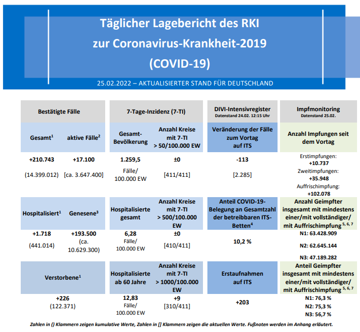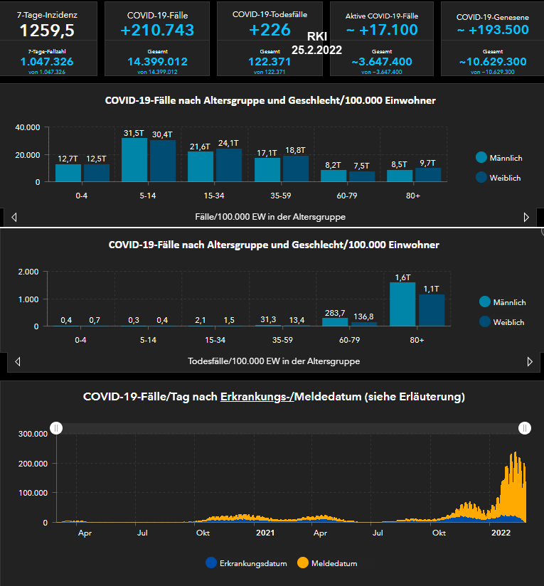 - 25.2.2022 Download 6:30 Uhr: 14.399.012 positiv Getestete, 226 Tote , Genesene etwa 10.629.300 / Inzidenz 1.259,5 alle Daten gemäß RKI Dashboard// Hospitalisierung gesamt 6,27 // ab 60: 12,81 pro 100.000 gemäß RKI Lagebericht