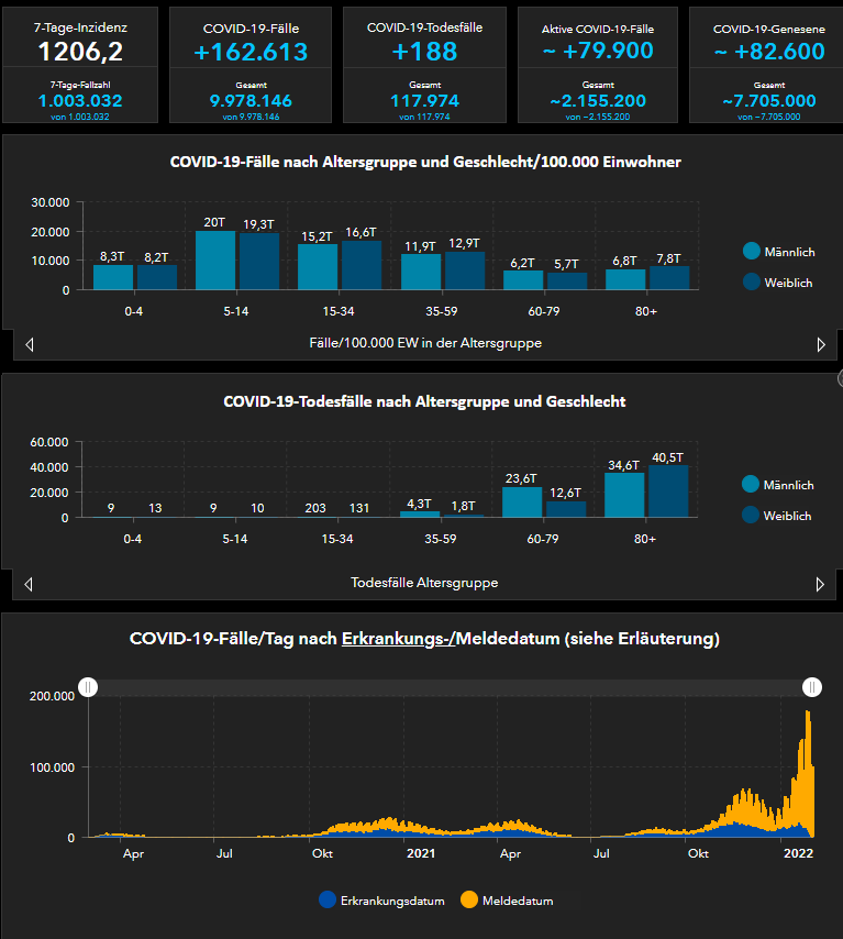 - 1.2.2022 Download 6:30 Uhr: 9.978.146 positiv Getestete, 188 Tote , Genesene etwa 7.705.000 / Inzidenz 1.206,2 alle Daten gemäß RKI Dashboard// Hospitalisierung gesamt 4,64 // ab 60: 7,43 pro 100.000 gemäß RKI Lagebericht