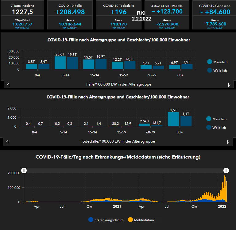 - 2.2.2022 Download 6:30 Uhr: 10.186.644 positiv Getestete, 196 Tote , Genesene etwa 7.705.000 / Inzidenz 1.206,2 alle Daten gemäß RKI Dashboard// Hospitalisierung gesamt 4,59 // ab 60: 7,36 pro 100.000 gemäß RKI Lagebericht