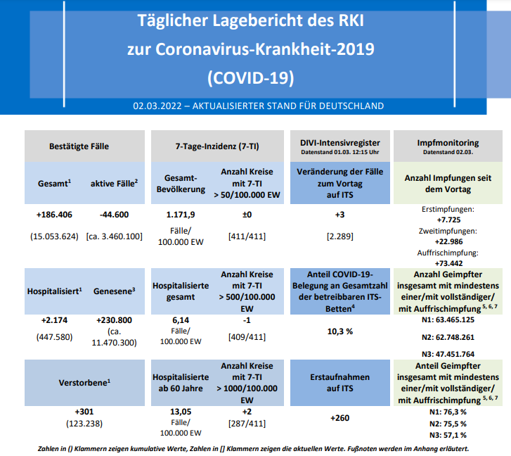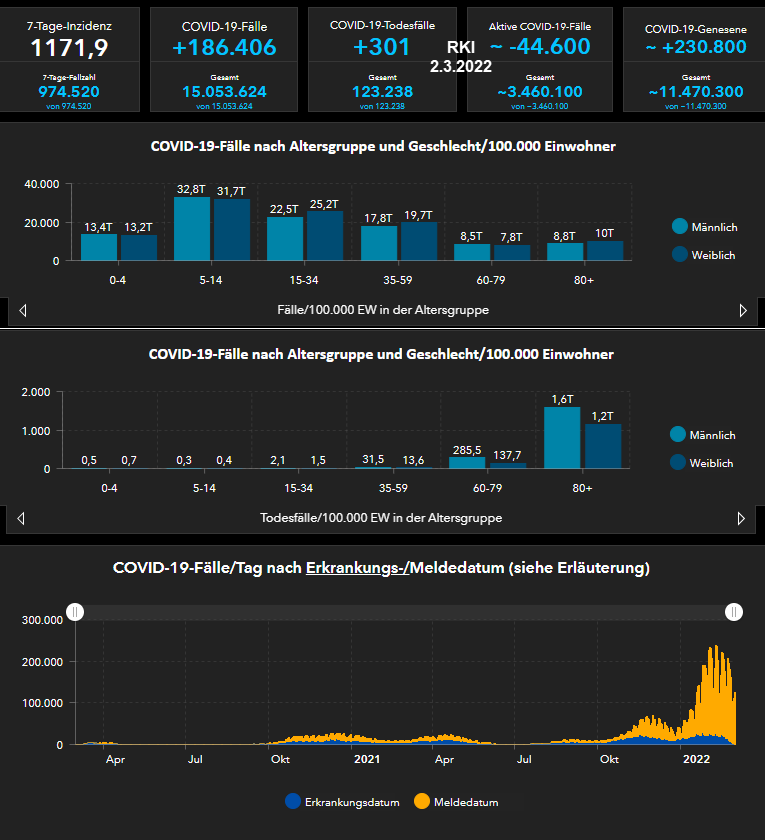 - 2.3.2022 Download 6:30 Uhr: 15.053.624 positiv Getestete, 301 Tote , Genesene etwa 11.470.300 / Inzidenz 1.171,9 alle Daten gemäß RKI Dashboard// Hospitalisierung gesamt 5,93// ab 60: 12,40 pro 100.000 gemäß RKI Lagebericht