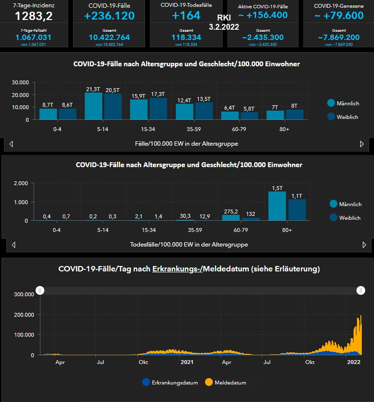 - 3.2.2022 Download 6:30 Uhr: 10.422.764 positiv Getestete, 164 Tote , Genesene etwa 7.869.200 / Inzidenz 1.283,2 alle Daten gemäß RKI Dashboard// Hospitalisierung gesamt 4,77 // ab 60: 7,71 pro 100.000 gemäß RKI Lagebericht