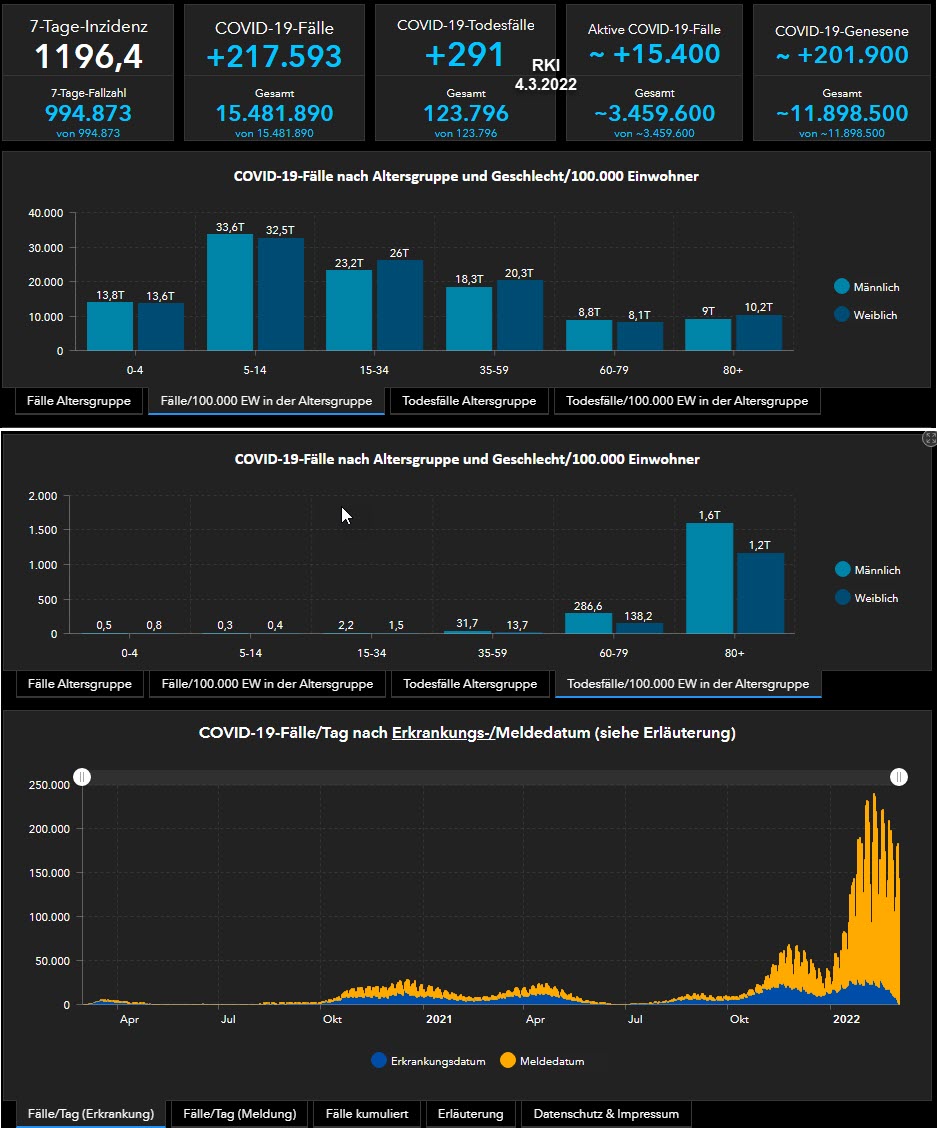 - 4.3.2022 Download 6:30 Uhr: 15.481.890 positiv Getestete, 291 Tote , Genesene etwa 11.898.500 / Inzidenz 1.196,6 alle Daten gemäß RKI Dashboard// Hospitalisierung gesamt 6,35// ab 60: 13,41 pro 100.000 gemäß RKI Lagebericht