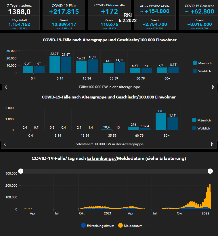 - 5.2.2022 Download 6:30 Uhr: 10.889.417 positiv Getestete, 172 Tote , Genesene etwa 8.016.000 / Inzidenz 1.388,0 alle Daten gemäß RKI Dashboard// Hospitalisierung gesamt 5,45 // ab 60: 9,27 pro 100.000 gemäß RKI Lagebericht