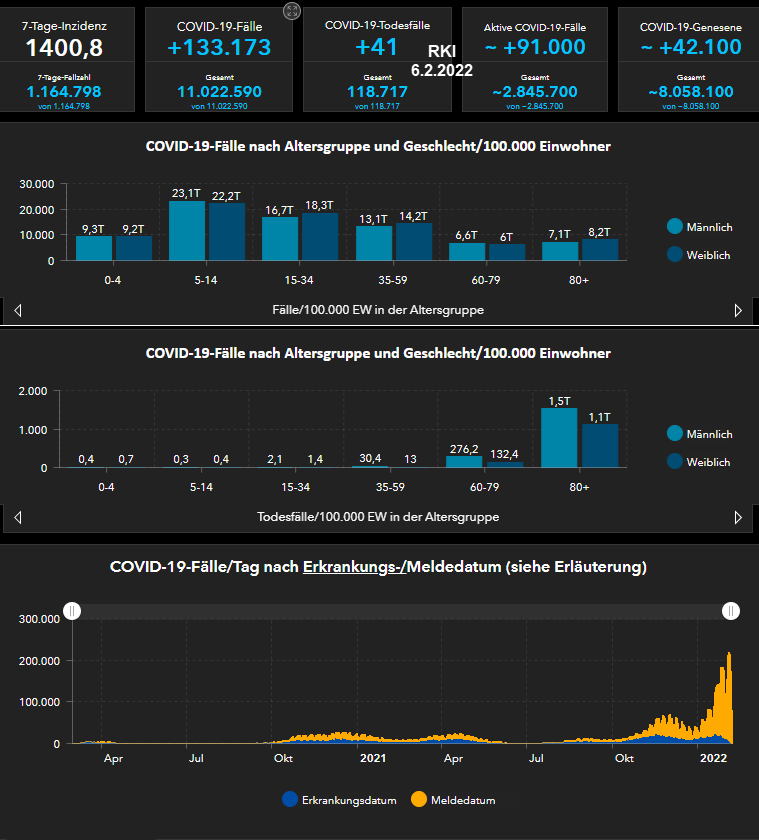 - 6.2.2022 Download 6:30 Uhr: 11.022.590 positiv Getestete, 41 Tote , Genesene etwa 8.058.100 / Inzidenz 1.400,8 alle Daten gemäß RKI Dashboard// Hospitalisierung gesamt 5,45 // ab 60: 9,27 pro 100.000 gemäß RKI Lagebericht
