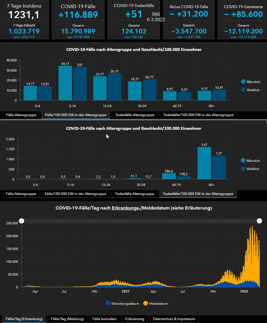 - 6.3.2022 Download 6:30 Uhr: 15.790.989 positiv Getestete, 51 Tote , Genesene etwa 12.119.200 / Inzidenz 1.231,1 alle Daten gemäß RKI Dashboard// Hospitalisierung gesamt 6,36// ab 60: 13,51 pro 100.000 gemäß RKI Lagebericht