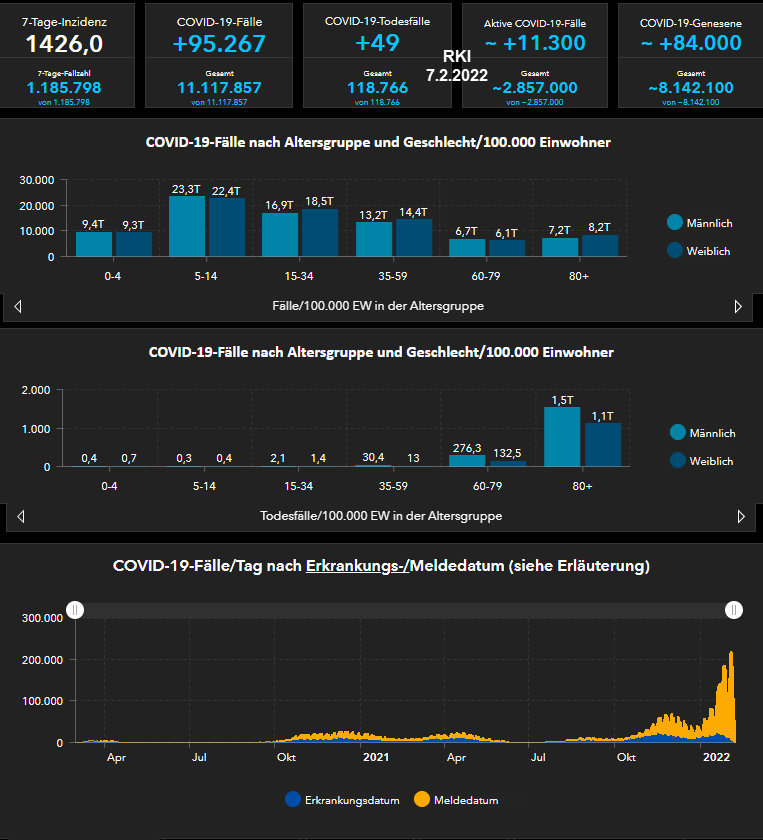 - 7.2.2022 Download 6:30 Uhr: 11.117.857 positiv Getestete, 49 Tote , Genesene etwa 8.142.200 / Inzidenz 1.426,0 alle Daten gemäß RKI Dashboard// Hospitalisierung gesamt 5,45 // ab 60: 9,27 pro 100.000 gemäß RKI Lagebericht