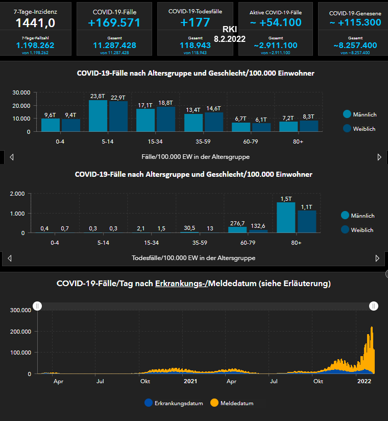 - 8.2.2022 Download 6:30 Uhr: 11.287.428 positiv Getestete, 177 Tote , Genesene etwa 8.57.400 / Inzidenz 1.441,0 alle Daten gemäß RKI Dashboard// Hospitalisierung gesamt 5,41 // ab 60: 9,56 pro 100.000 gemäß RKI Lagebericht