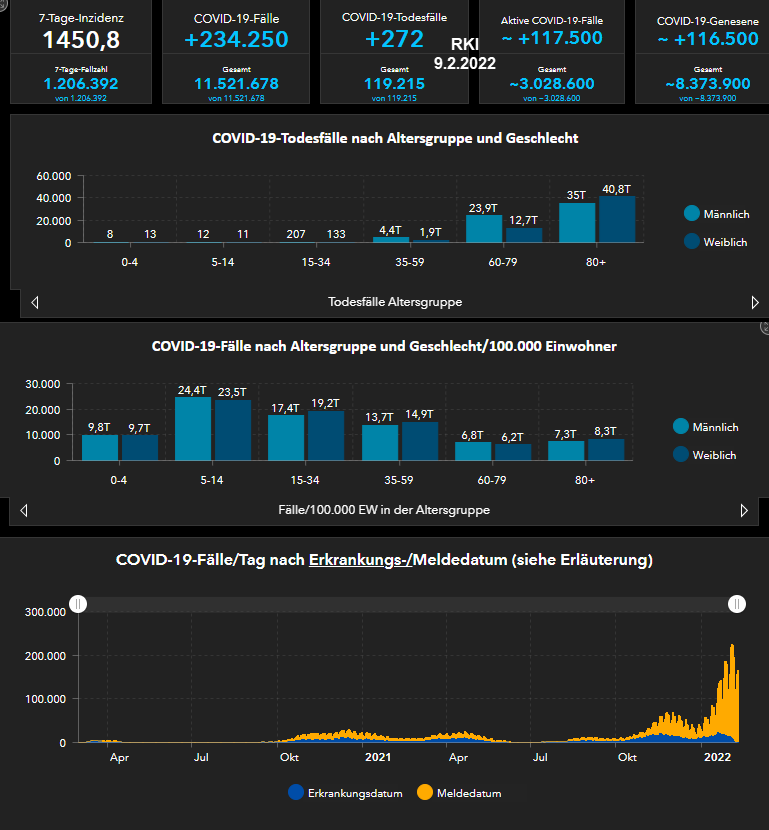 - 9.2.2022 Download 6:30 Uhr: 11.521.658 positiv Getestete, 272 Tote , Genesene etwa 8.372.900 / Inzidenz 1.450,8 alle Daten gemäß RKI Dashboard// Hospitalisierung gesamt 5,65 // ab 60: 10,65 pro 100.000 gemäß RKI Lagebericht