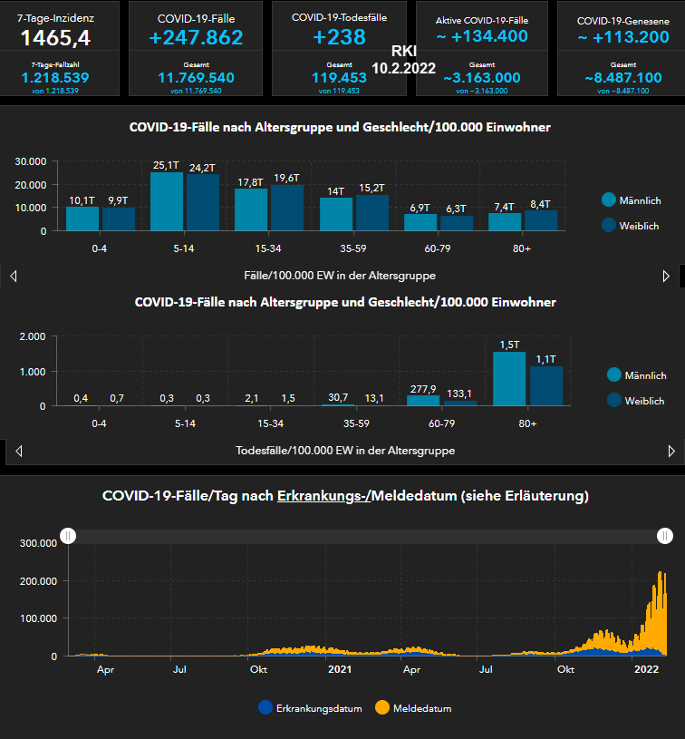 - 10.2.2022 Download 6:30 Uhr: 11.769.540 positiv Getestete, 238 Tote , Genesene etwa 8.487.100 / Inzidenz 1.465,4 alle Daten gemäß RKI Dashboard// Hospitalisierung gesamt 6,07 // ab 60: 11,65 pro 100.000 gemäß RKI Lagebericht