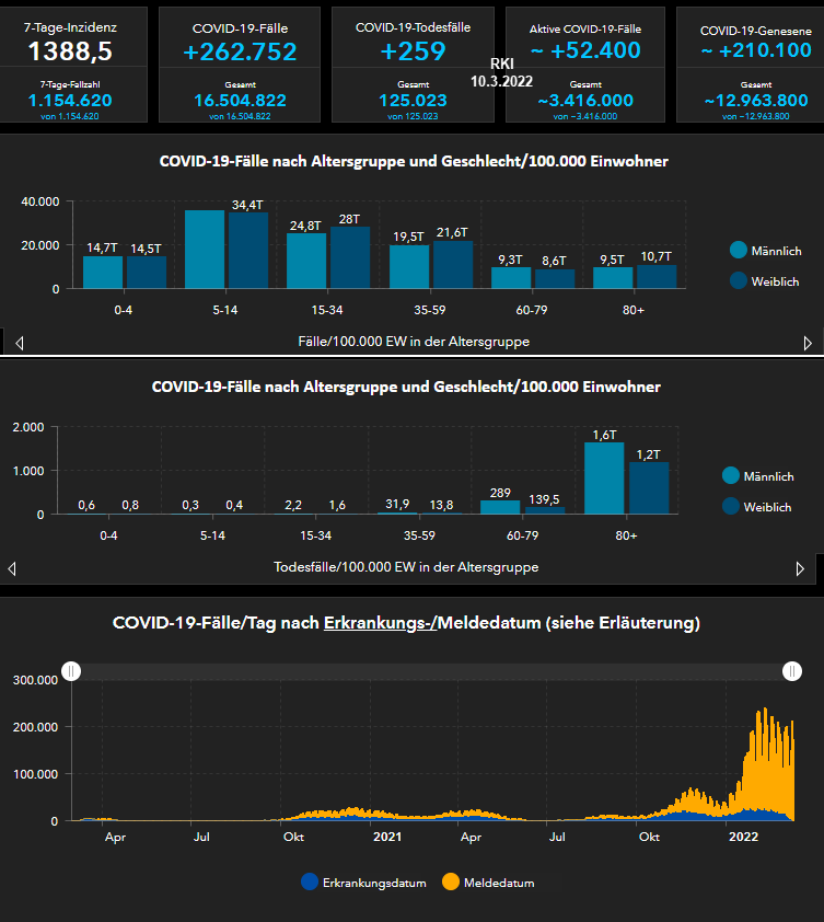 - 10.3.2022 Download 6:30 Uhr: 16.504.882 positiv Getestete, 259 Tote , Genesene etwa 12.963,800/ Inzidenz 1.388,5 alle Daten gemäß RKI Dashboard// Hospitalisierung gesamt 6,62// ab 60: 13,76 pro 100.000 gemäß RKI Lagebericht