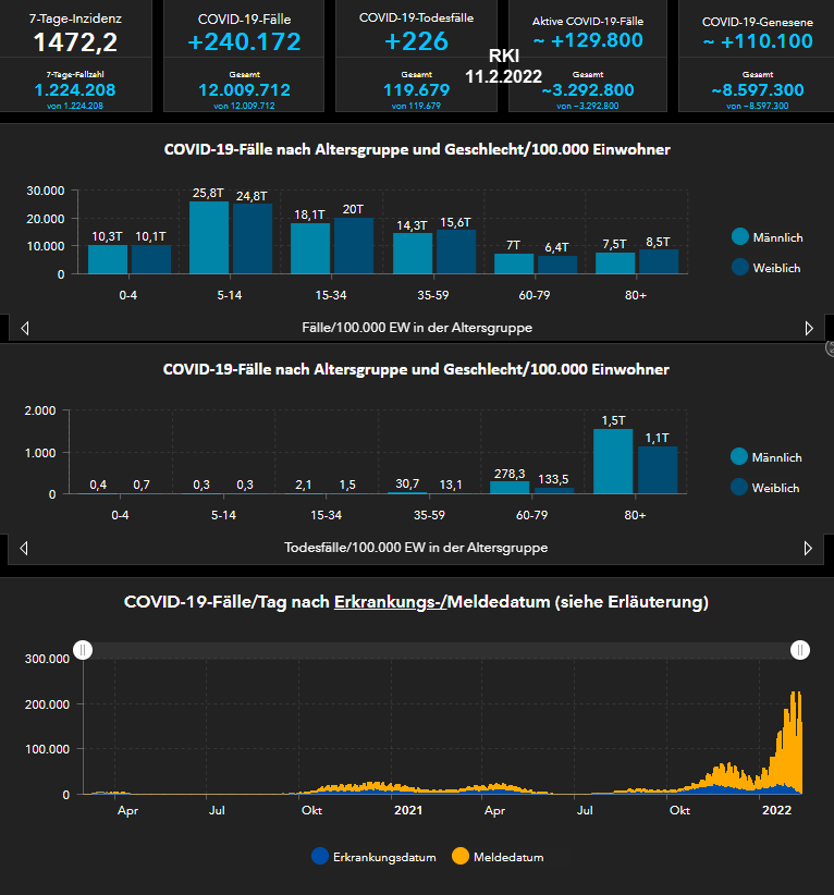 - 11.2.2022 Download 6:30 Uhr: 12.009.712 positiv Getestete, 226 Tote , Genesene etwa 8.597.300 / Inzidenz 1.472,4 alle Daten gemäß RKI Dashboard// Hospitalisierung gesamt 6,23 // ab 60: 11,65 pro 100.000 gemäß RKI Lagebericht