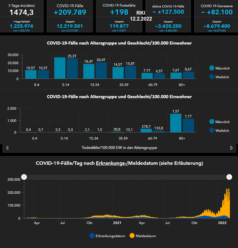- 12.2.2022 Download 6:30 Uhr: 12.219.501 positiv Getestete, 198 Tote , Genesene etwa 8.679.400 / Inzidenz 1.474,3 alle Daten gemäß RKI Dashboard// Hospitalisierung gesamt 6,46 // ab 60: 12,06 pro 100.000 gemäß RKI Lagebericht