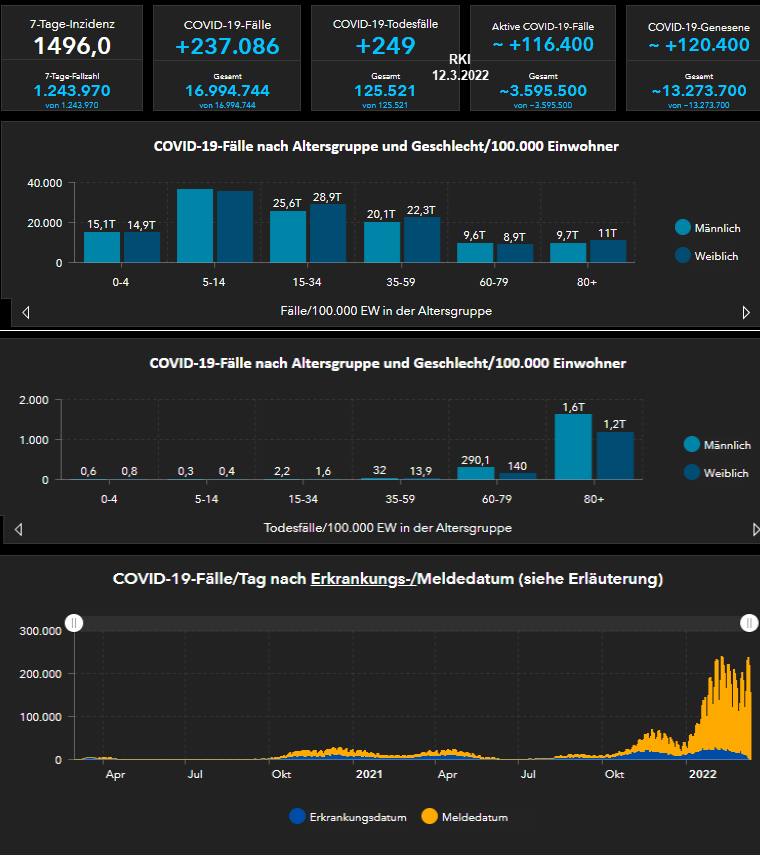 - 12.3.2022 Download 6:30 Uhr: 16.994.744 positiv Getestete, 249 Tote , Genesene etwa 13.273.700/ Inzidenz 1.496,0 alle Daten gemäß RKI Dashboard// Hospitalisierung gesamt 7,00// ab 60: 14,70 pro 100.000 gemäß RKI Lagebericht