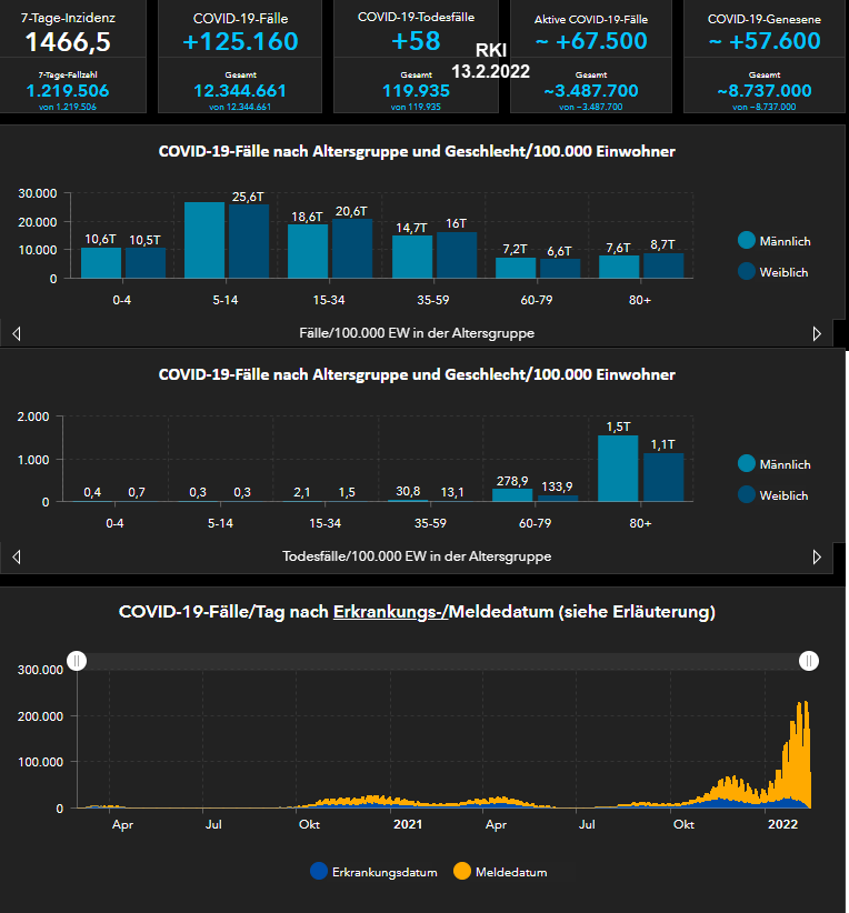 - 13.2.2022 Download 6:30 Uhr: 12.344.661 positiv Getestete, 58 Tote , Genesene etwa 8.737.300/ Inzidenz 1.466,5 alle Daten gemäß RKI Dashboard// Hospitalisierung gesamt 6,46 // ab 60: 12,06 pro 100.000 gemäß RKI Lagebericht