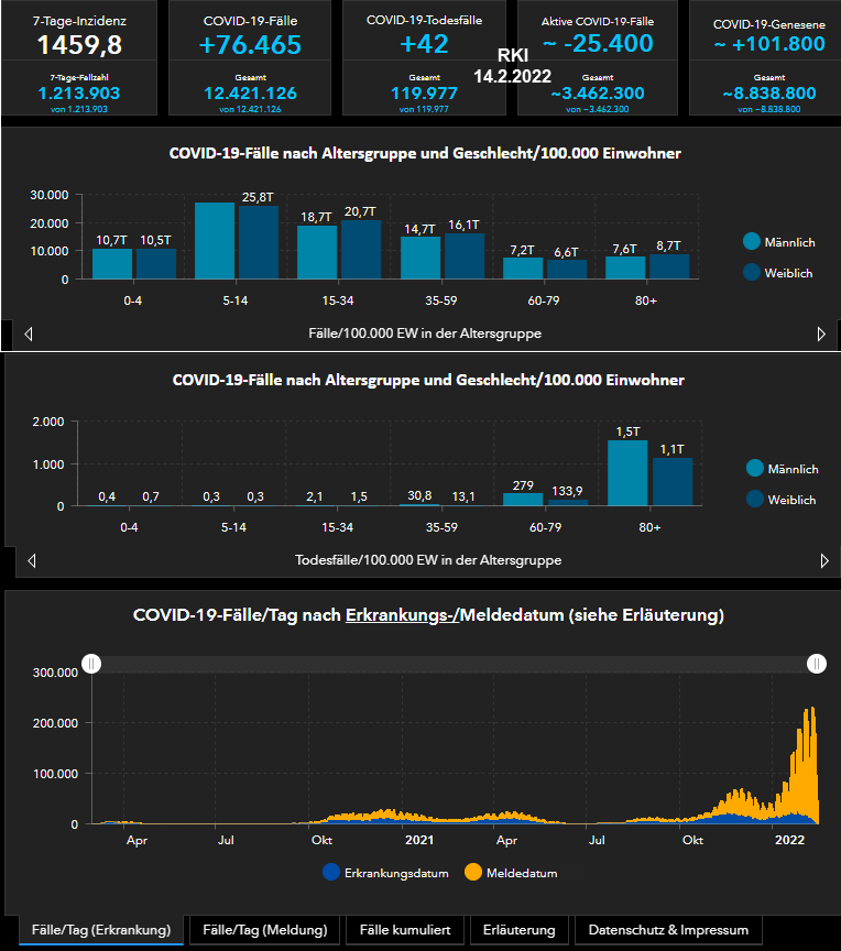 - 14.2.2022 Download 6:30 Uhr: 12.421.126 positiv Getestete, 42 Tote , Genesene etwa 8.838.800 / Inzidenz 1.459,8 alle Daten gemäß RKI Dashboard// Hospitalisierung gesamt 6,46 // ab 60: 12,06 pro 100.000 gemäß RKI Lagebericht