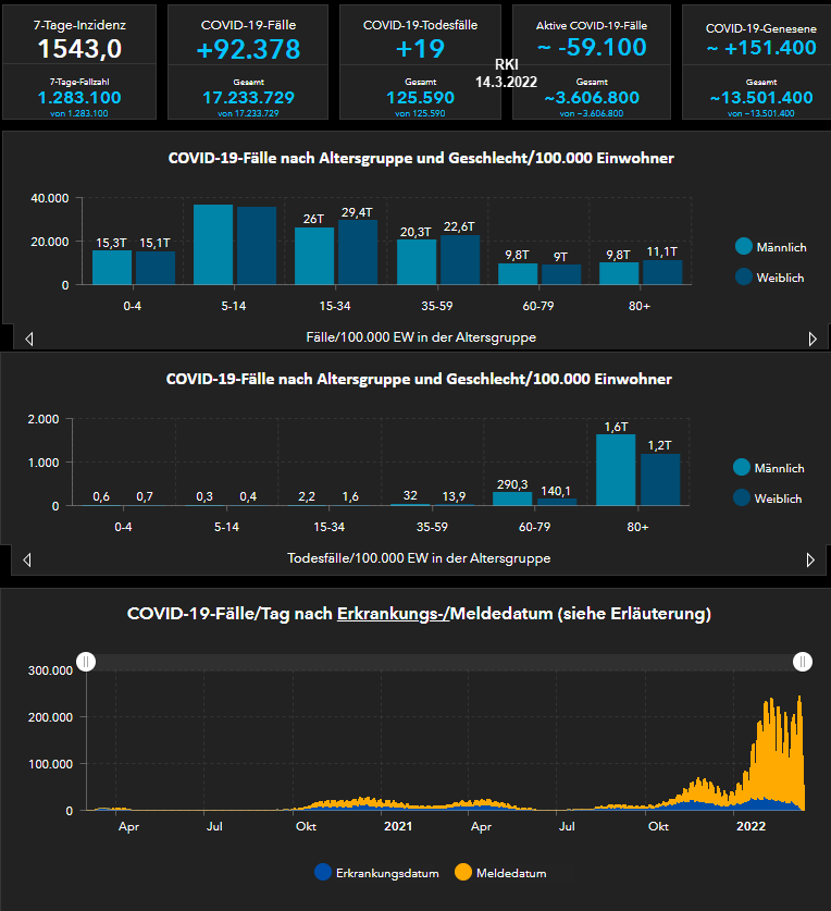 - 14.3.2022 Download 6:30 Uhr: 17.233.729positiv Getestete, 19 Tote , Genesene etwa 13.501.500/ Inzidenz 1.543,0 alle Daten gemäß RKI Dashboard// Hospitalisierung gesamt 7,00// ab 60: 14,70 pro 100.000 gemäß RKI Lagebericht