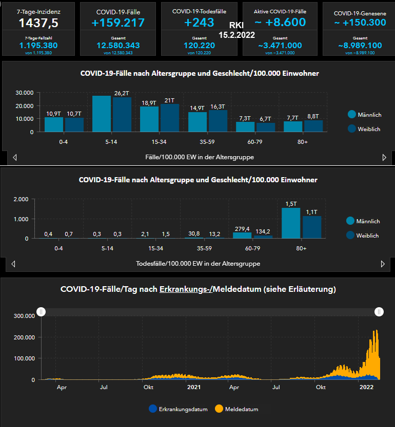 - 15.2.2022 Download 6:30 Uhr: 12.580.343 positiv Getestete, 243 Tote , Genesene etwa 8.989.800 / Inzidenz 1.437,5 alle Daten gemäß RKI Dashboard// Hospitalisierung gesamt 5,93 // ab 60: 11,11 pro 100.000 gemäß RKI Lagebericht
