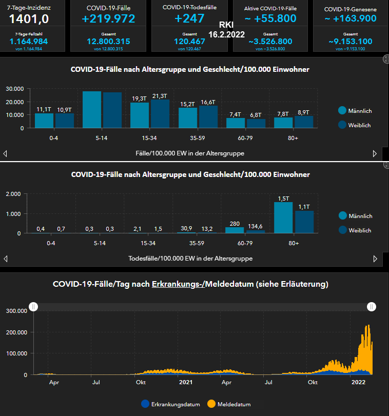 - 16.2.2022 Download 6:30 Uhr: 12.899.315 positiv Getestete, 247 Tote , Genesene etwa 9.153.100 / Inzidenz 1.401,0 alle Daten gemäß RKI Dashboard// Hospitalisierung gesamt 5,90 // ab 60: 11,17 pro 100.000 gemäß RKI Lagebericht