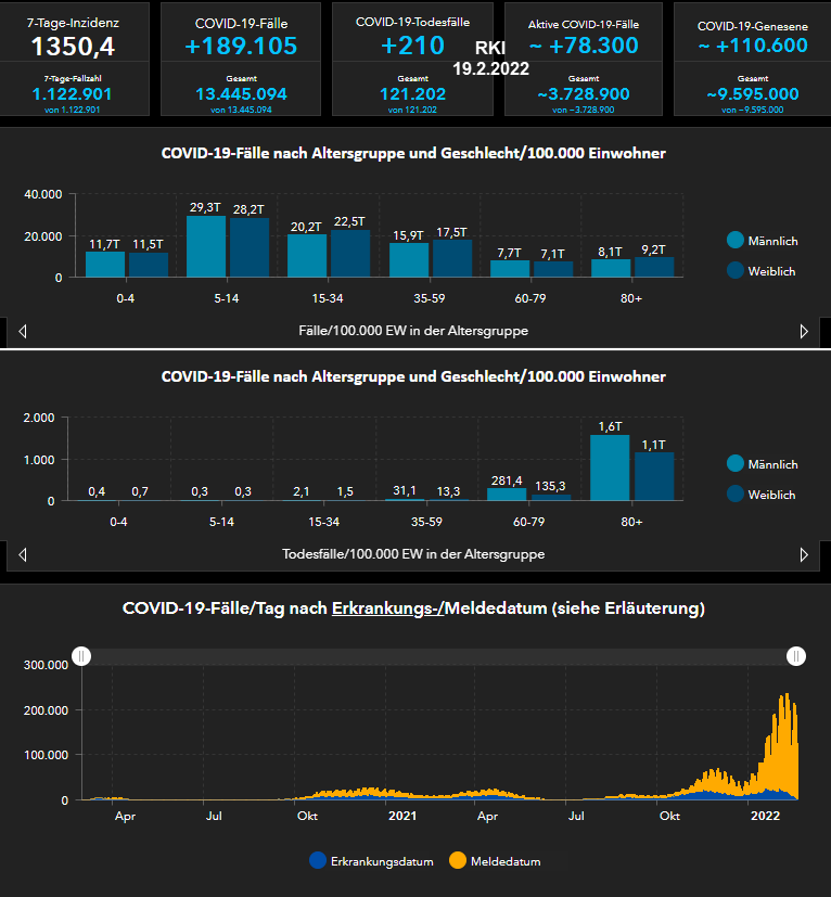 - 19.2.2022 Download 6:30 Uhr: 13.445.095 positiv Getestete, 210 Tote , Genesene etwa 9.595.000 / Inzidenz 1.350,4 alle Daten gemäß RKI Dashboard// Hospitalisierung gesamt 6,24 // ab 60: 12,25 pro 100.000 gemäß RKI Lagebericht