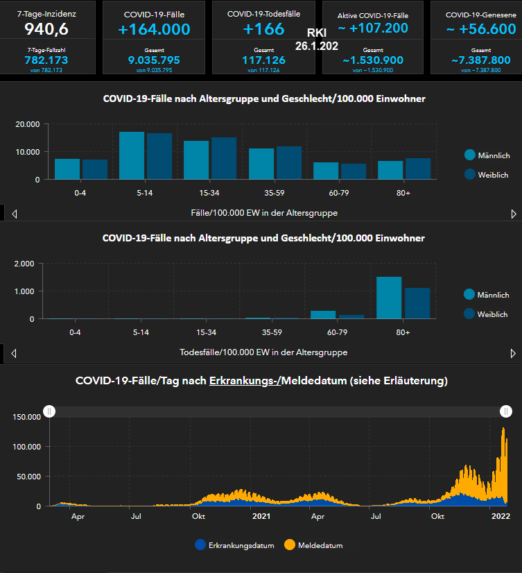 - 26.1.2022 Download 6:30 Uhr: 9.030.795 positiv Getestete, 166 Tote , Genesene etwa 7.387.800 / Inzidenz 940,4 alle Daten gemäß RKI Dashboard// Hospitalisierung gesamt 4,07/ ab 60: 6,11 pro 100.000 gemäß RKI Lagebericht