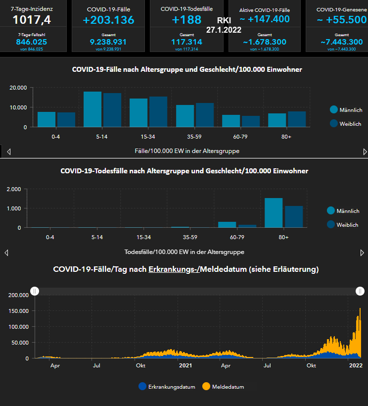 - 27.1.2022 Download 6:30 Uhr: 9.238.931 positiv Getestete, 188 Tote , Genesene etwa 7.443.300 / Inzidenz 1.017,4 alle Daten gemäß RKI Dashboard// Hospitalisierung gesamt 4,26 // ab 60: 6,45 pro 100.000 gemäß RKI Lagebericht