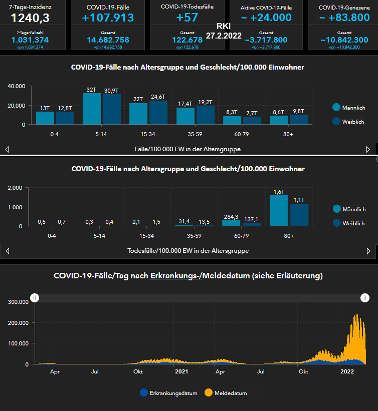 - 27.2.2022 Download 6:30 Uhr: 14.682.758 positiv Getestete, 57 Tote , Genesene etwa 10.842.300 / Inzidenz 1.240,3 alle Daten gemäß RKI Dashboard// Hospitalisierung gesamt 6,23 // ab 60: 12,83 pro 100.000 gemäß RKI Lagebericht