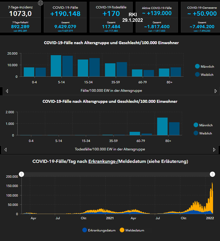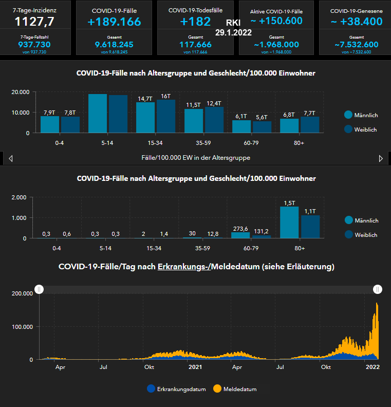 - 29.1.2022 Download 6:30 Uhr: 9.618.245 positiv Getestete, 182 Tote , Genesene etwa 7.532.600 / Inzidenz 1.127,7 alle Daten gemäß RKI Dashboard// Hospitalisierung gesamt 4,72 // ab 60: 7,33 pro 100.000 gemäß RKI Lagebericht
