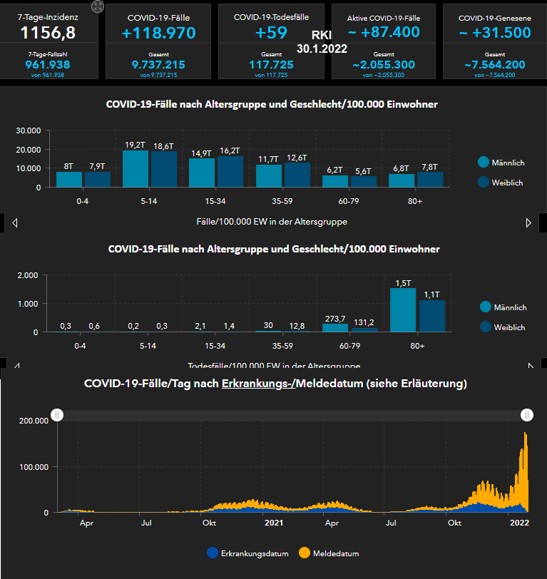 - 30.1.2022 Download 6:30 Uhr: 9.737.215 positiv Getestete, 59 Tote , Genesene etwa 7.564.200 / Inzidenz 1.156,8 alle Daten gemäß RKI Dashboard// Hospitalisierung gesamt 4,72 // ab 60: 7,33 pro 100.000 gemäß RKI Lagebericht