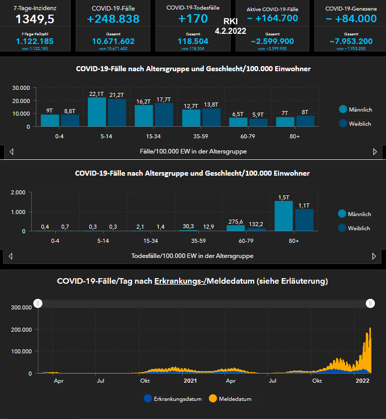 - 4.2.2022 Download 6:30 Uhr: 10.671.602 positiv Getestete, 170 Tote , Genesene etwa 7.953.200 / Inzidenz 1.349,5 alle Daten gemäß RKI Dashboard// Hospitalisierung gesamt 5,00 // ab 60: 8,35 pro 100.000 gemäß RKI Lagebericht