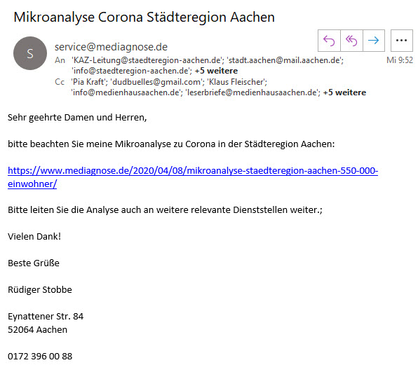 - Eingedenk dieser Tatsachen, sind die Maßnahmen, die in der in der Städteregion Aachen getroffen wurden, und für die OB Keupen sowie Städteregionsrat Tim Grüttemeier und Frau Dr. Gube, Leiterin des Gesundheitsamtes Aachen, mit verantwortlich zeichnen, vollkommen überzogen und unverhältnismäßig.