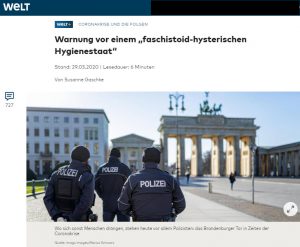 … in einen Zustand, in dem viele der normalen Regeln des Zusammenlebens nicht mehr gelten und verfassungsrechtlich garantierte Rechte suspendiert sind. Die Fortbewegungsfreiheit und die Freiheit der Wahl des Aufenthaltsorts sind massiv beschränkt worden. Die Ausübung der Berufsfreiheit wird Millionen von Geschäftsleuten, Handwerkern, Gastwirten, Hoteliers, Musikern und anderen Künstlern unmöglich gemacht. Schüler und Studenten können ihr Recht auf Bildung nur noch sehr eingeschränkt wahrnehmen. Die Religionsfreiheit kann nur noch zu Hause oder über die Funkmedien wahrgenommen werden. Die Versammlungsfreiheit ist vollständig suspendiert.