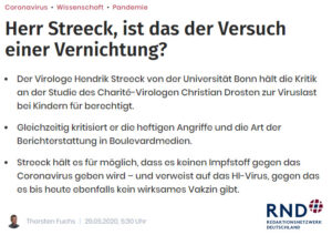 … der mitten in der Corona-Krise die Gangelt-Studie – als noch nichts von Seiten des RKI in Sachen Forschung unternommen wurde – medial sehr präsent war, hört man kaum noch etwas. Dabei hat er für die Zukunft mit Corona eine dezidierte Meinung, die – man lese und staune – der meinen weitgehend – m. E. können auch Großevents wieder erlaubt werden, der Lockdown kann KOMPLETT aufgehoben werden – entspricht: