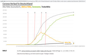 - 2 = Aktive Fälle (Positiv Getestete ./. Genesene ./. Verstorbene) steigen weniger langsam, als die Zahl der positiv Getesteten